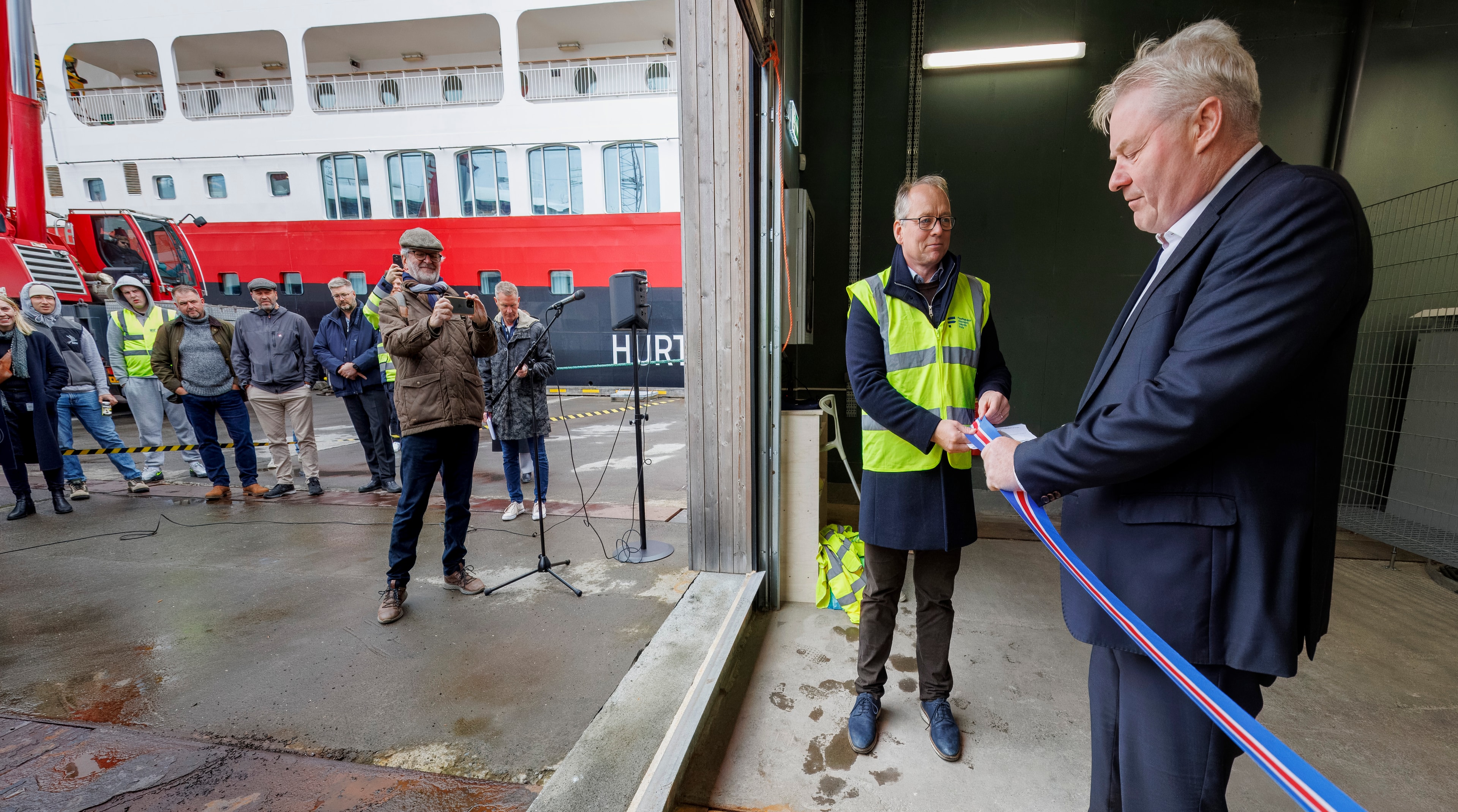 • Þórdís Lóa Þórhallsdóttir, formaður stjórnar Faxaflóahafna, bauð gesti velkomna og Gunnar Tryggvason, Hafnarstjóri Faxaflóahafna, kynnti landtenginguna áður en Sigurður Ingi Jóhannsson innviðaráðherra klippti formlega á borða í tilefni landtengingarinnar